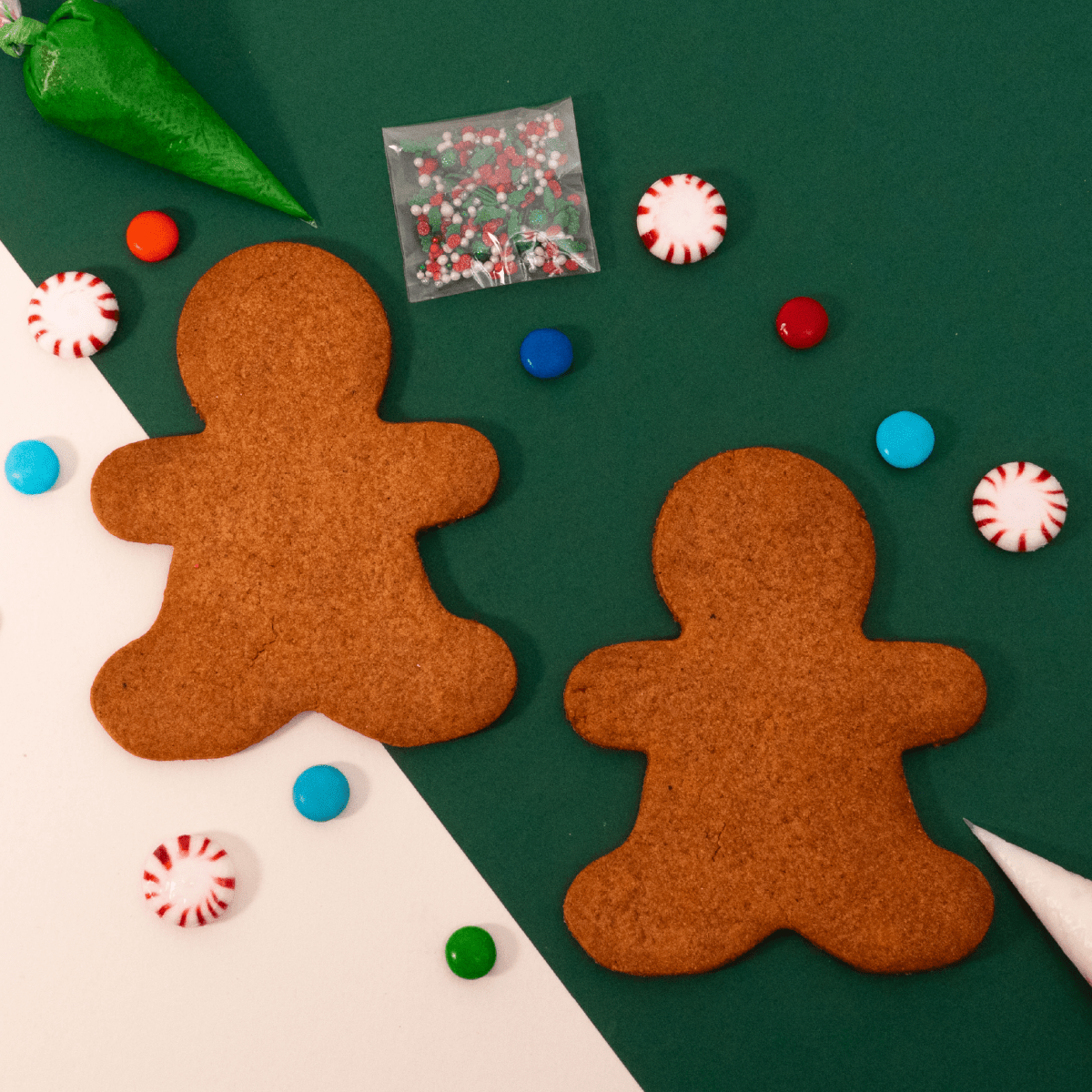 KIT MIÑECOS DE JENGIBRE: 2 galletas jumbo de jengibre, glaseado, dulces.